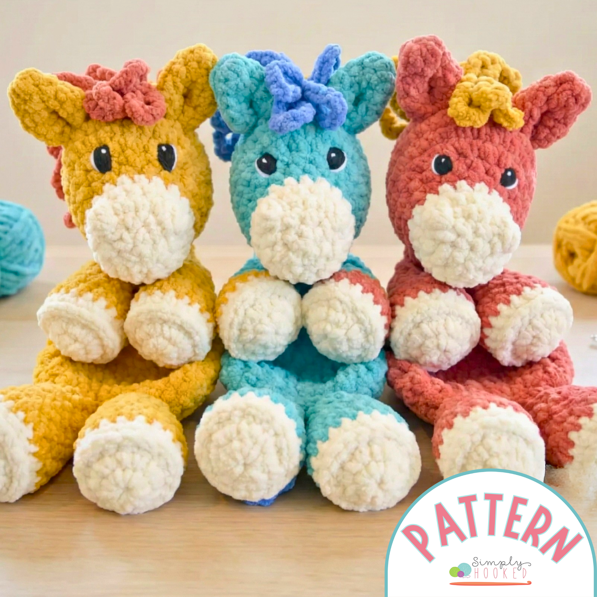 Make a cuddly crochet horse plush with this beginner-friendly amigurumi pattern PDF. It features an unstuffed body for easy snuggling and includes step-by-step instructions on how to embroider baby-safe eyes.
