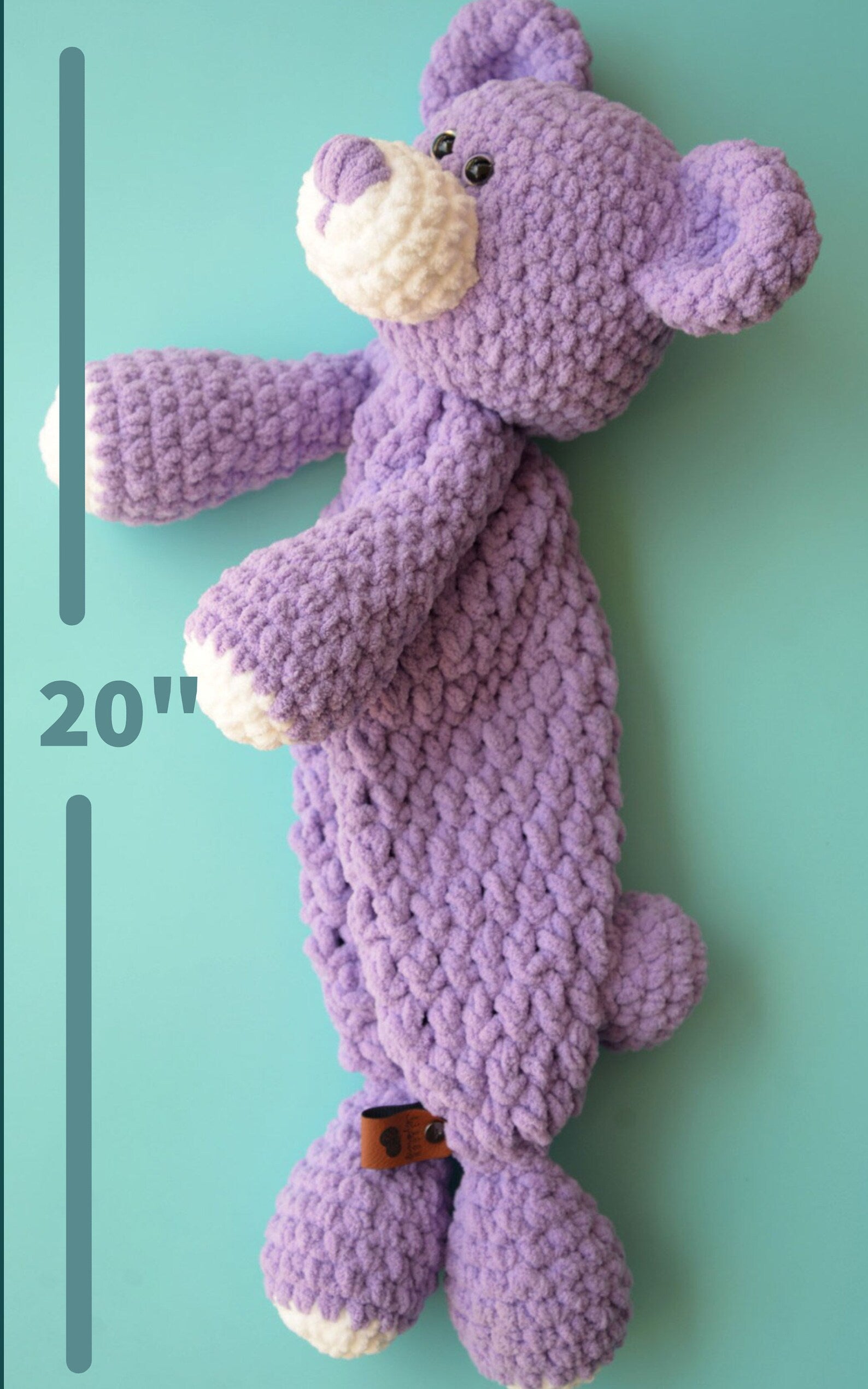 The finished crochet teddy bear measures about 20 inches long—perfect for snuggles!