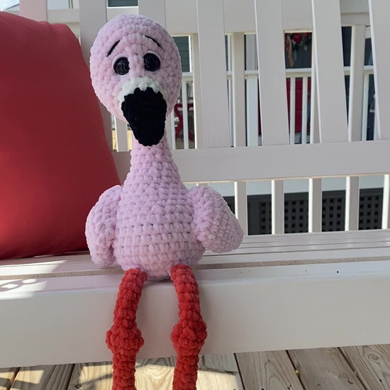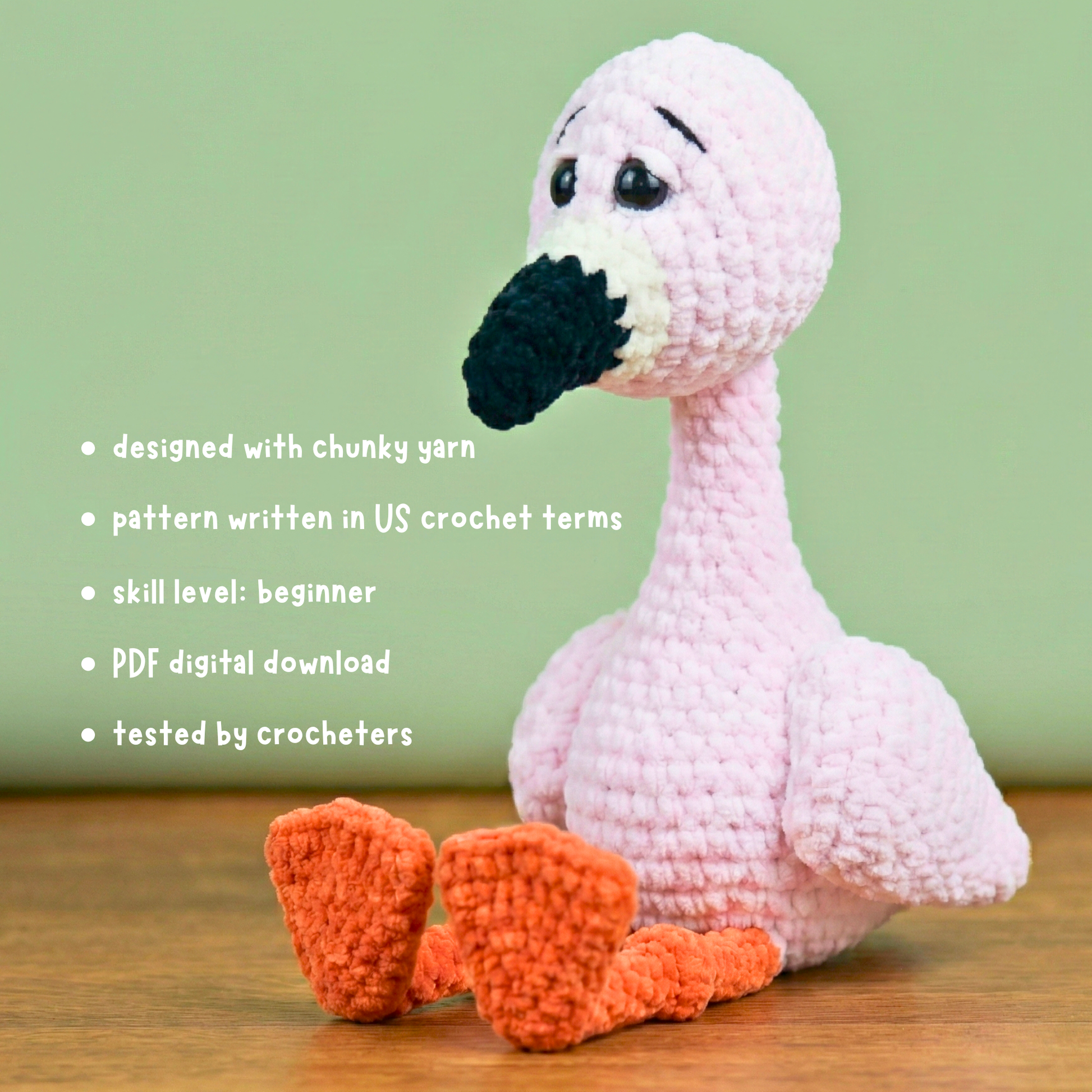 This flamingo crochet pattern is beginner-friendly and guides confident crocheters through each step to create a soft, squishy flamingo plush using Premier Parfait Chunky yarn.