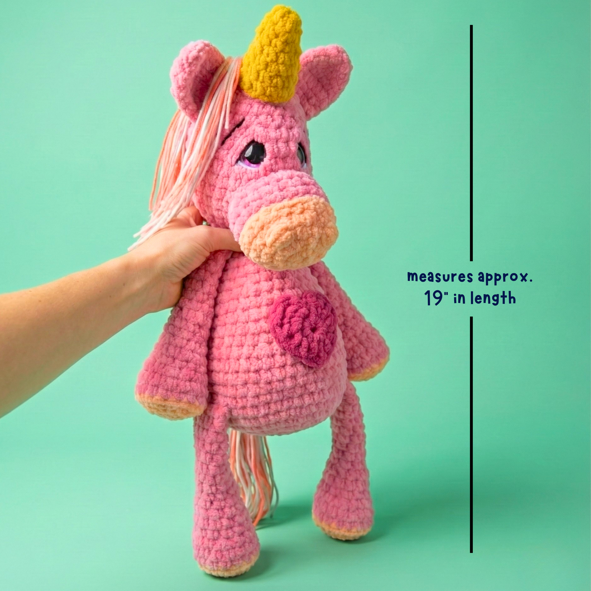 Designed with the confident beginner in mind, this pattern takes the intimidation out of making large stuffed animals. Using super soft chenille-style yarn, this unicorn works up quickly and results in a velvety, textured finish that is perfect for cuddling. This is a Digital PDF Download.